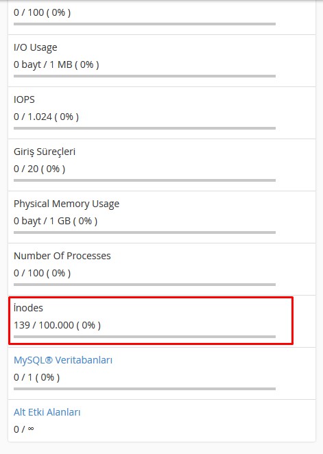 İnode (index node) metadata (dosya yapısı, dosya büyüklüğü vs.) bilgilerini bulundurmaktadır. İnode limiti, Linux işletim sisteminde bulunan veri yapısı bilgilerini içermektedir. İnode sayısı hesabınızda bulunan dosya sayısını ifade etmektedir. Yani hosting hesabınızda bulunan her bir dosya (email, resim vs.) bir inode anlamına gelmektedir. Hesabınızda bulunan tüm dosyaların toplamı İnode sayısını oluşturmaktadır.